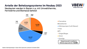 Der Verband der Bayerischen Energie- und Wasserwirtschaft e.V. – VBEW hat angesichts der Kältewelle die Beheizungs- systeme in Neubauwohnungen analysiert und die Anteile in einer Graphik veranschaulicht. Nach einer Veröffentlichung des Bayerischen Landesamtes für Statistik wurden im Jahr 2019 in Bayern 51.726 Wohnungen in neu errichteten Gebäuden fertiggestellt. „Etwa ein Drittel der neuen Wohnungen wird mit Gas beheizt, Öl- und Strom-Direktheizungen spielen heute in Neubauten kaum noch eine Rolle“, fasst Detlef Fischer, VBEW-Geschäftsführer, zusammen. „Auf 10-Jahres-Sicht kann ein deutlicher Trend im Neubau hin zu Strom-Wärmepumpen, aber auch zur Fernwärme, beobachtet werden – und auf niedrigem Niveau sieht man eine Renaissance der Holzheizungen“.
