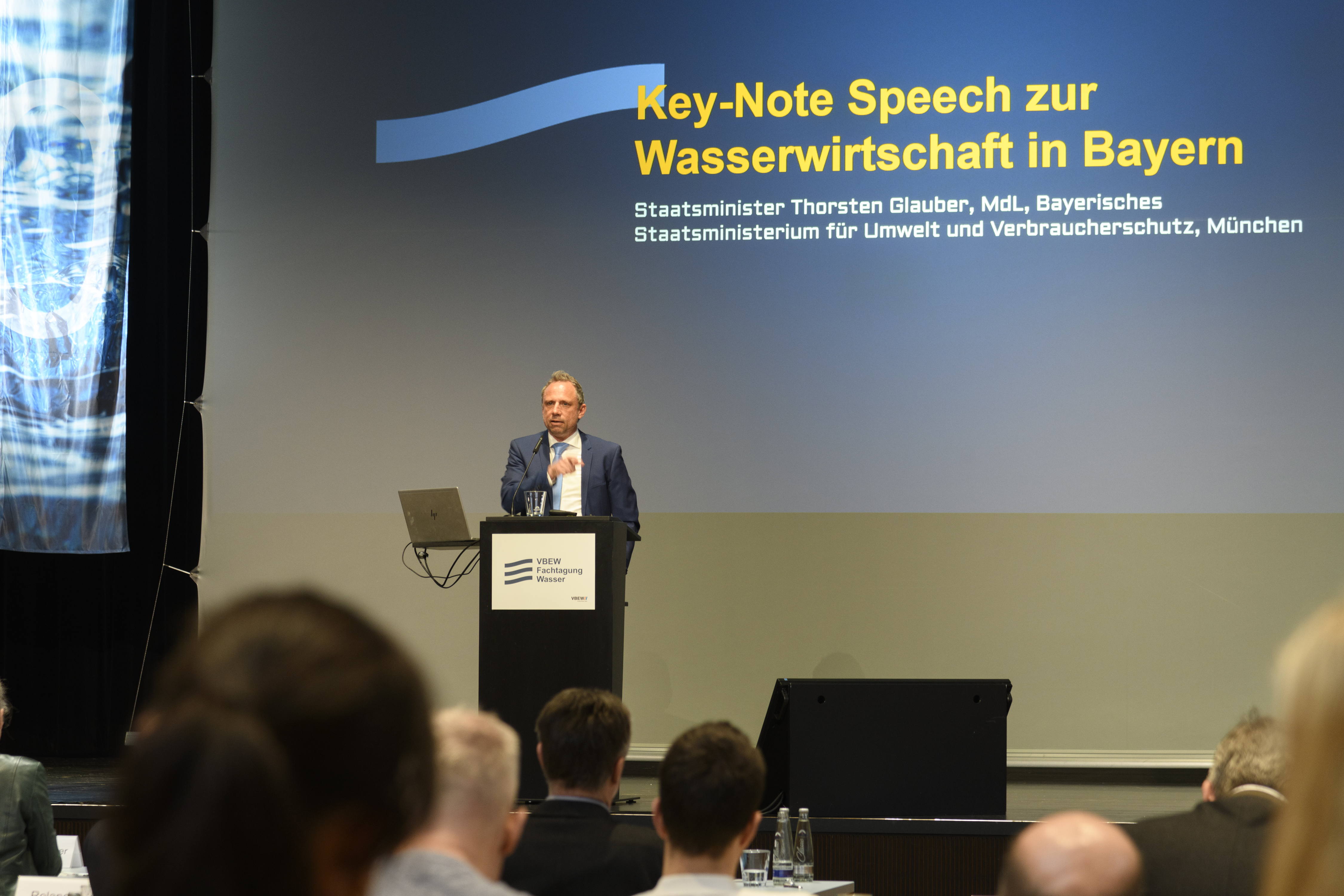 Bayerns Staatsminister für Umwelt und Verbraucherschutz, Thorsten Glauber, betonte in seiner Keynote-Speech zur Eröffnung der Tagung: "Eine gesicherte Wasserversorgung gehört zu den größten Zukunftsaufgaben. Unsere kostbarste Ressource muss geschützt werden. Klar ist: Wassermanagement geht nur gemeinsam. Kommunen, Verbände, Wissenschaft, Industrie und Verwaltung arbeiten dafür Hand in Hand. Das jährliche Expertentreffen des VBEW bringt alle wichtigen Vertreter der Wasser- und Energiebranche zusammen. Das ist ein bedeutender Baustein für eine nachhaltige Versorgung Bayerns mit Wasser und Energie."