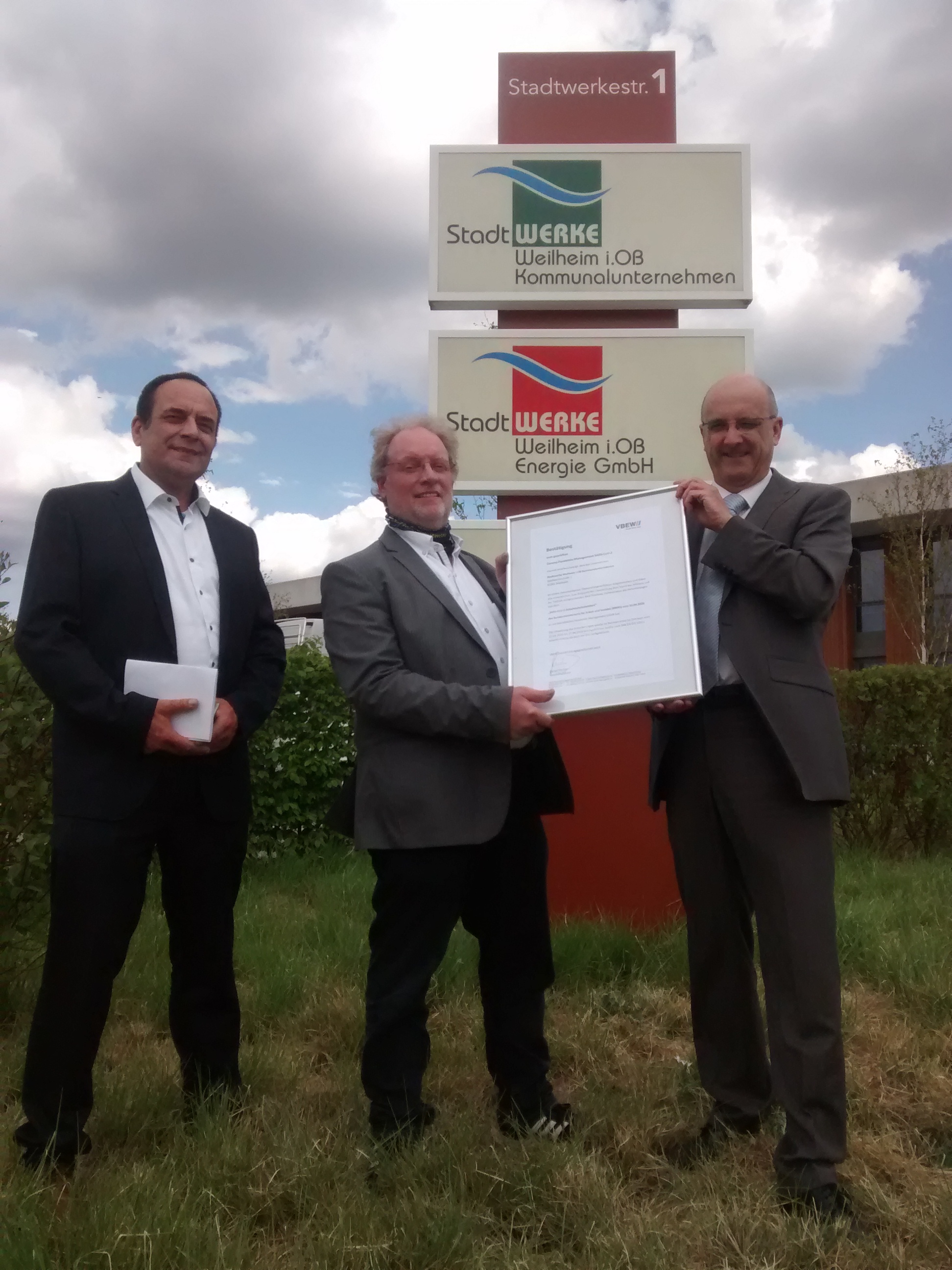 v.l.n.r.: Herr Volker Noe, Geschäftsführer der OCTOTHORPE GmbH, Herr Peter Müller, Vorstand und Geschäftsführer der Stadtwerke Weilheim und Herr Detlef Fischer, Geschäftsführer der VBEW Dienstleistungsgesellschaft mbH, freuen sich über das absolvierte Audit und die Bestätigung der getroffenen Pandemiemanagementmaßnahmen.