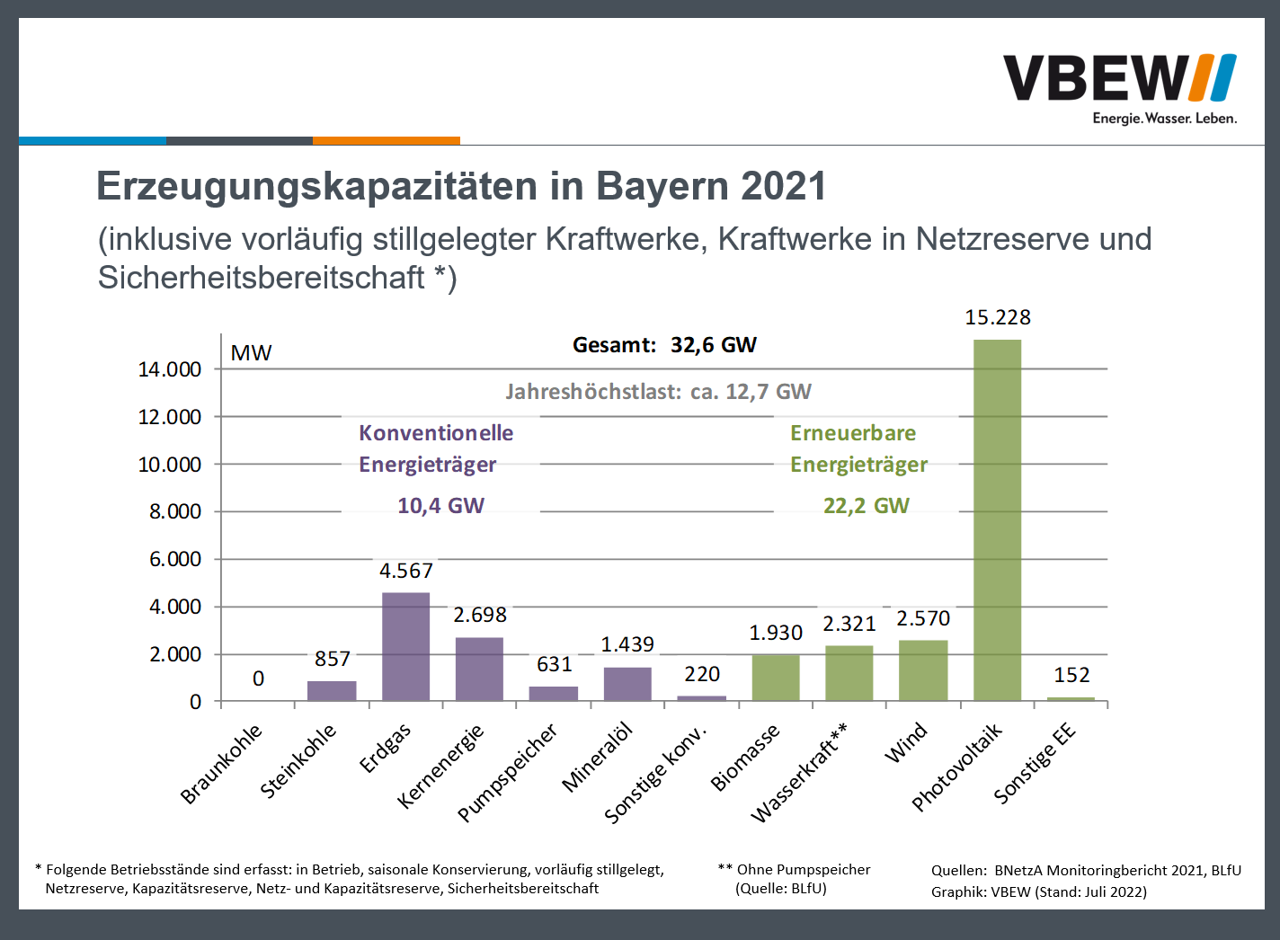 Nur auf den ersten Blick sehen die Zahlen zur bayerischen Stromversorgung im Monitoringbericht 2021 der Bundesnetzagentur (BNetzA) gar nicht so schlecht aus. Im Jahr 2021 waren in Bayern 10,4 GW an Stromerzeugungsleistung aus konventionellen Energieträgern (inkl. Kraftwerke in Reserve) und weitere 22,2 GW aus erneuerbaren Energieträgern installiert. „Im kommenden Winter könnte es trotzdem sehr eng werden für die Stromversorgungslage in Bayern“, warnt Detlef Fischer, „denn der Großteil der dann noch vorhandenen installierten Leistung kann keineswegs als gesichert verfügbar angesehen werden.“